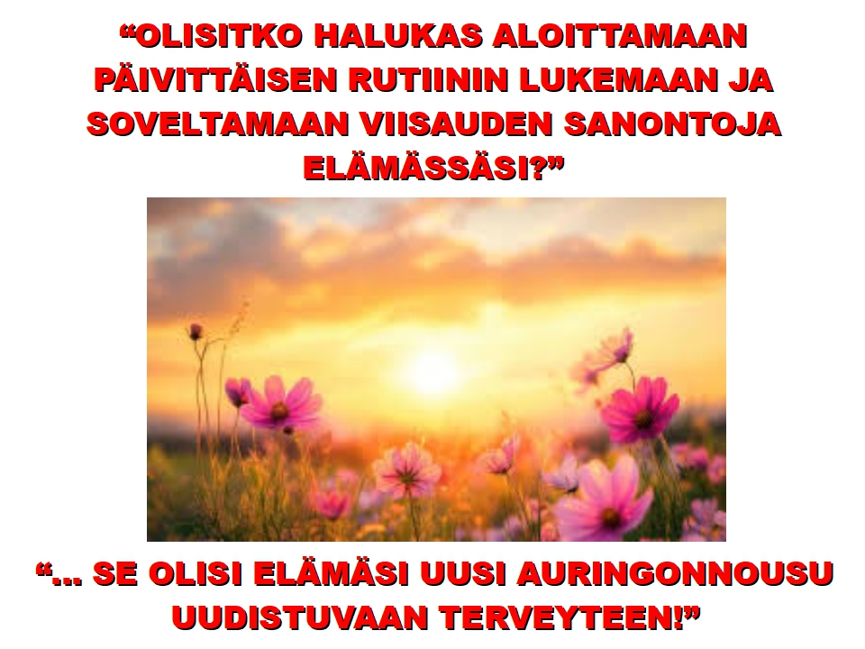 Linkki kaikkiin viisauden sanontoihin yllä olevissa kirjoituksissa. Ne ovat hyviä moniin tilanteisiin elämässä antamaan viisasta ohjausta “HYVIEN VIISAUDEN SANONTOJEN KOKOELMA”: https://wisdomflowersblog.wordpress.com/viisauden-sanontojen-kokoelma/